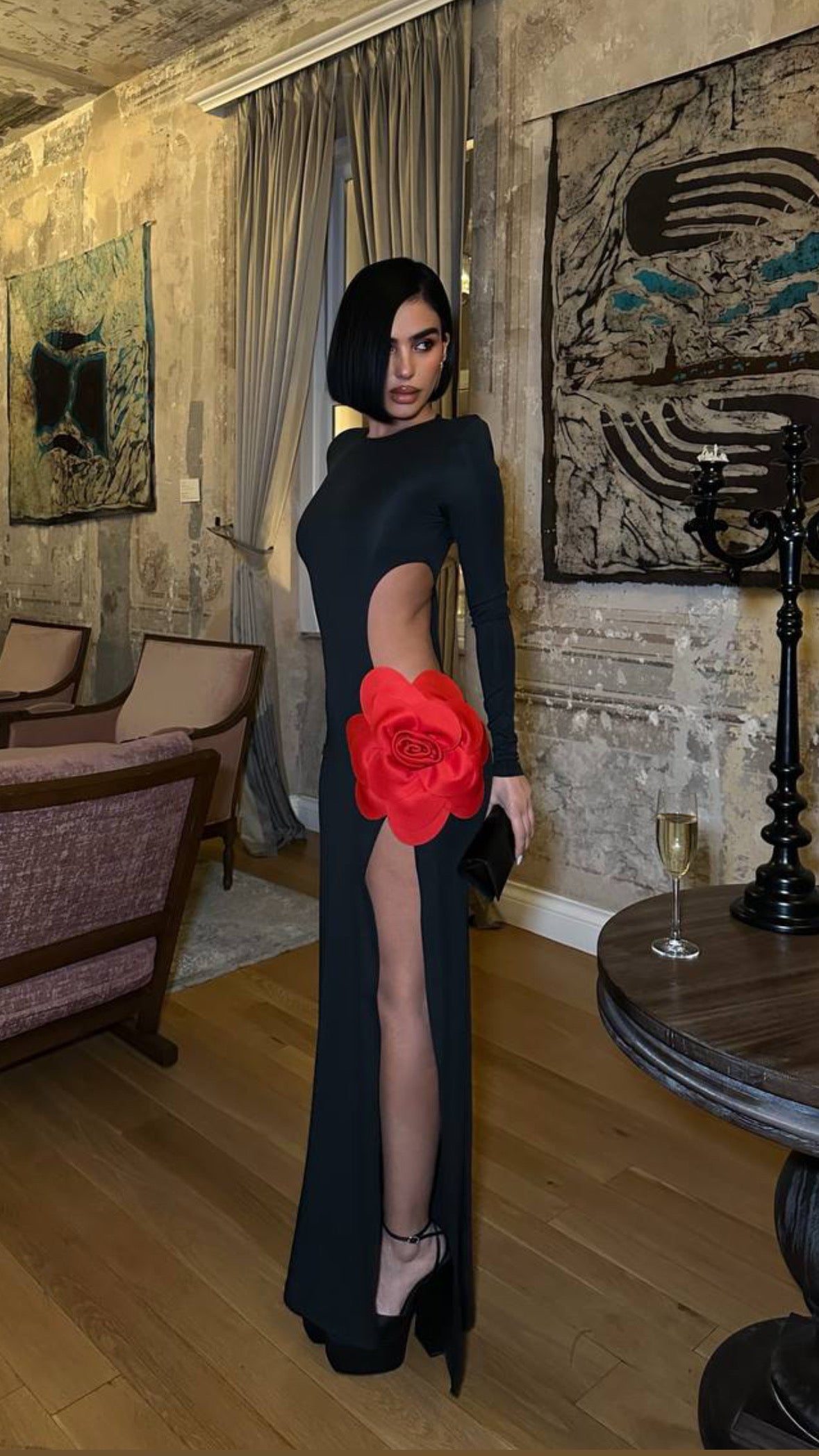 Dettaglio iconico: grande fiore nero applicato sul fianco, che crea un contrasto raffinato e audace.