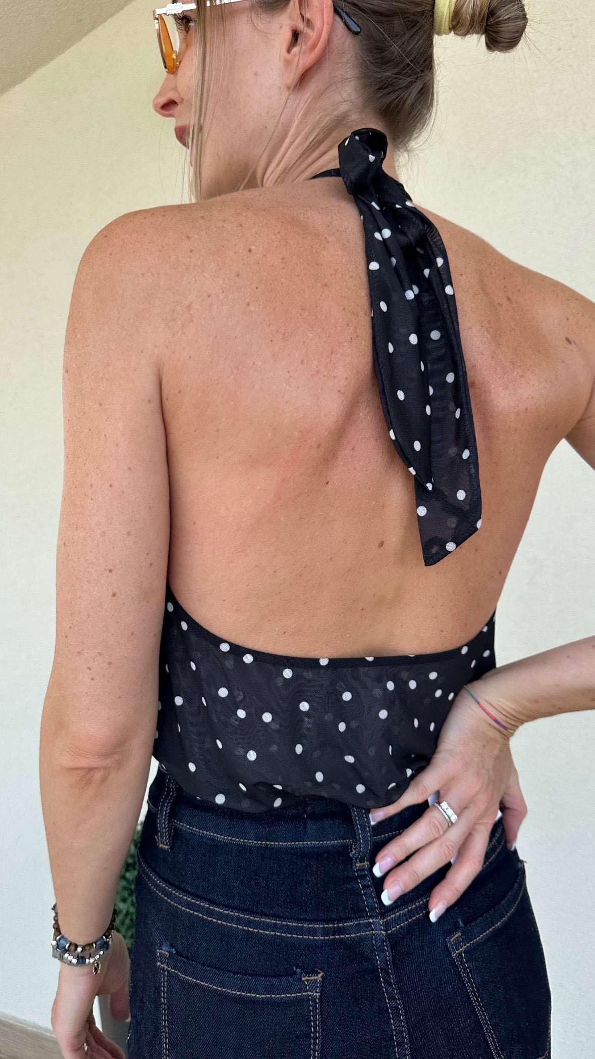 Body in tulle in fantasia pois con drappeggi.Presenta scollo halter regolabile.Scollatura ampia posteriore. Chiusura con bottoni a pressione al fondo.Vestibilità regolare, disponibile in taglia S/M,